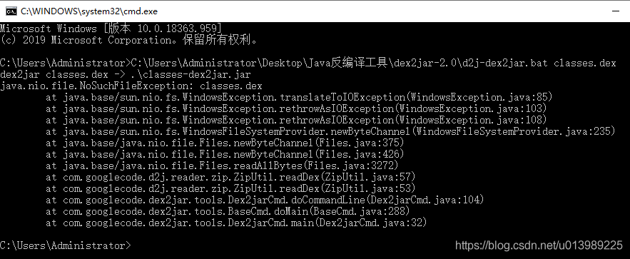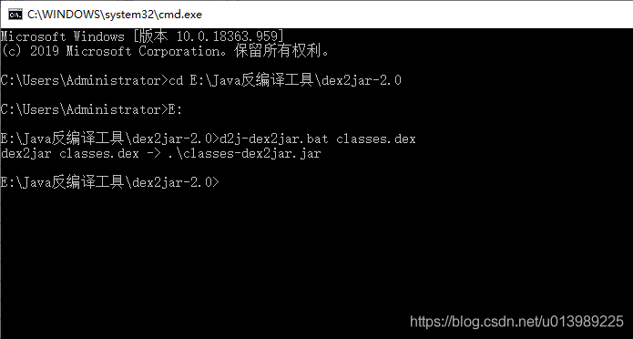 也就是先用cd E:\\Java反編譯工具\(yùn)\dex2jar-2.0的格式定位到d2j-dex2jar.bat所在目錄,然后敲回車(chē)表面上回到了一開(kāi)始的狀態(tài)。接著我們?cè)俅屋斎雂2j-dex2jar.bat所在盤(pán)符 + “:”,比如E:,再次敲擊回車(chē),就成功定位到了2j-dex2jar.bat所在目錄,然后輸入d2j-dex2jar.bat classes.dex,回車(chē)就在dex2jar-2.0目錄中多一個(gè)classes-dex2jar.jar文件出來(lái)了,說(shuō)明反編譯成功。具體操作如下圖所示: